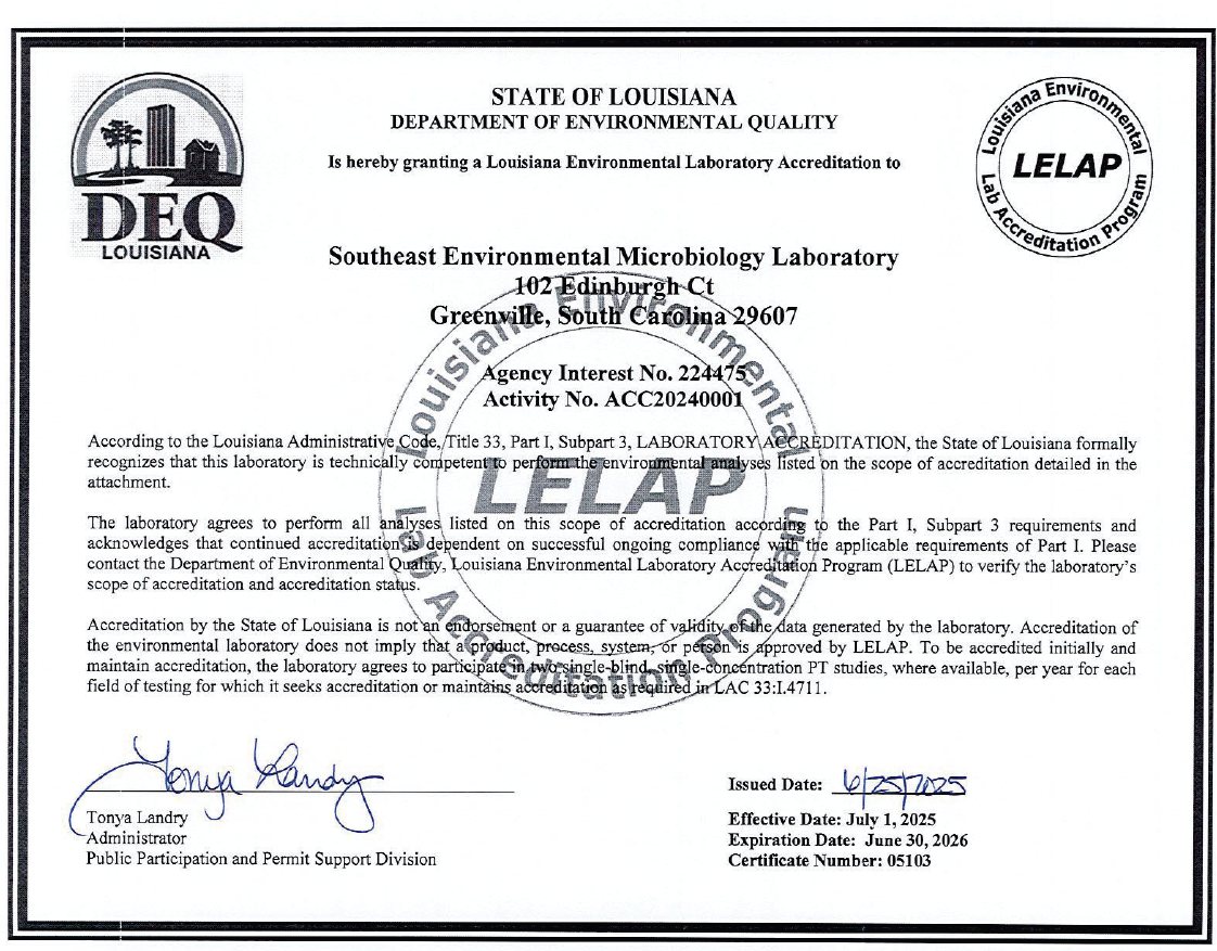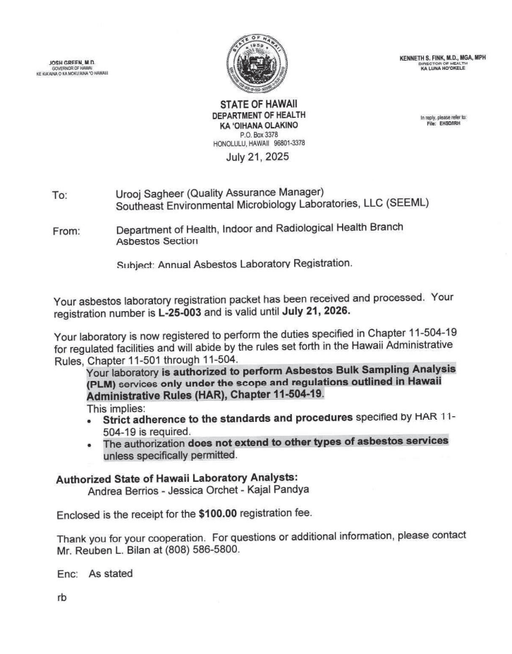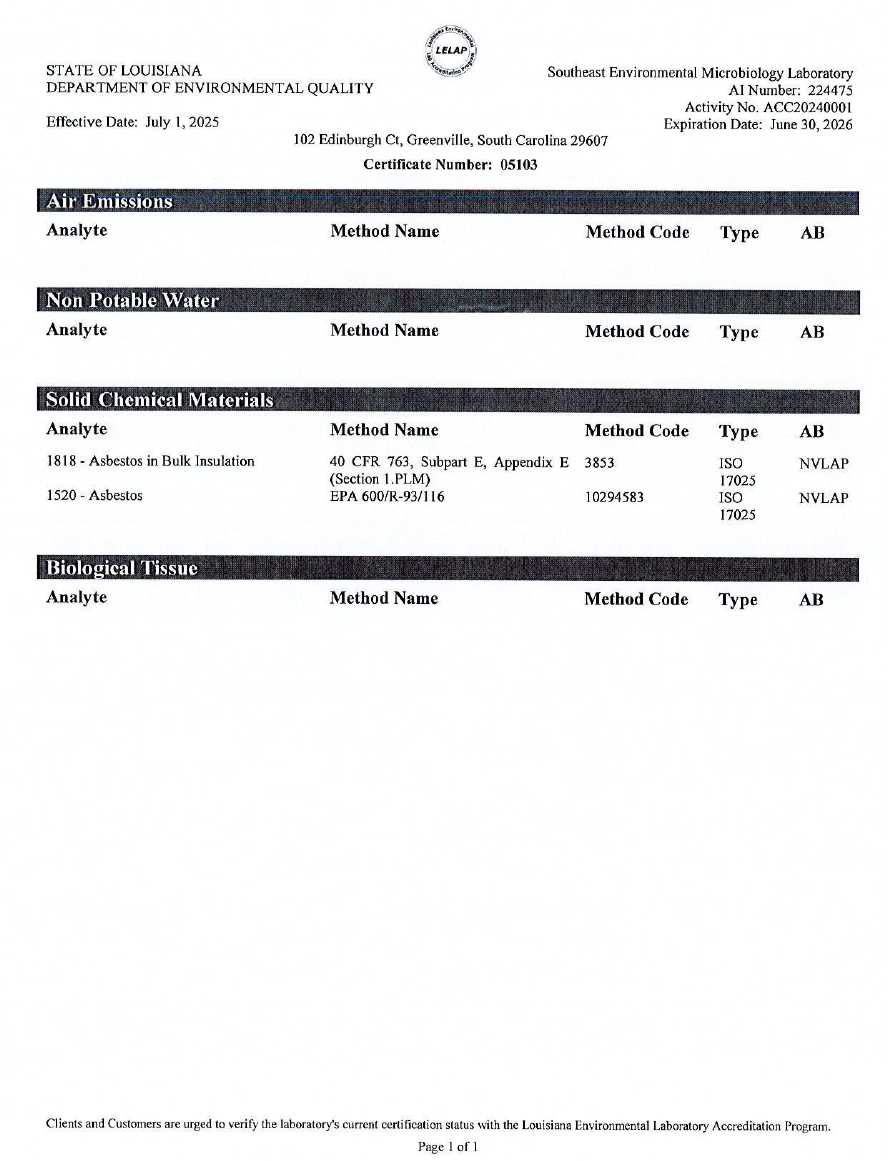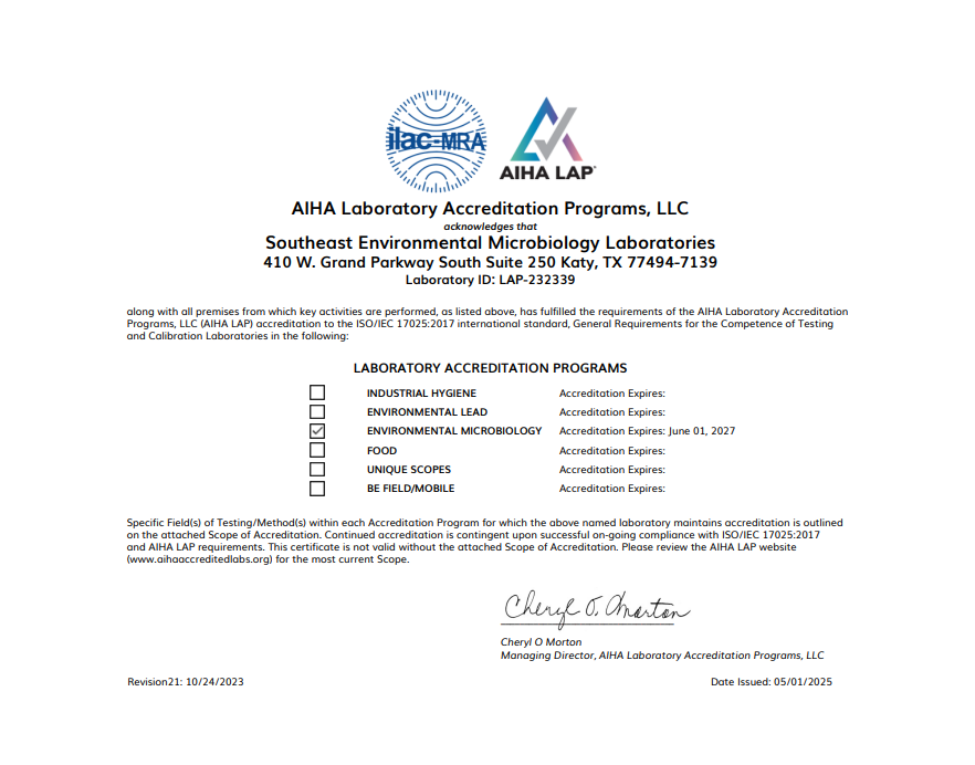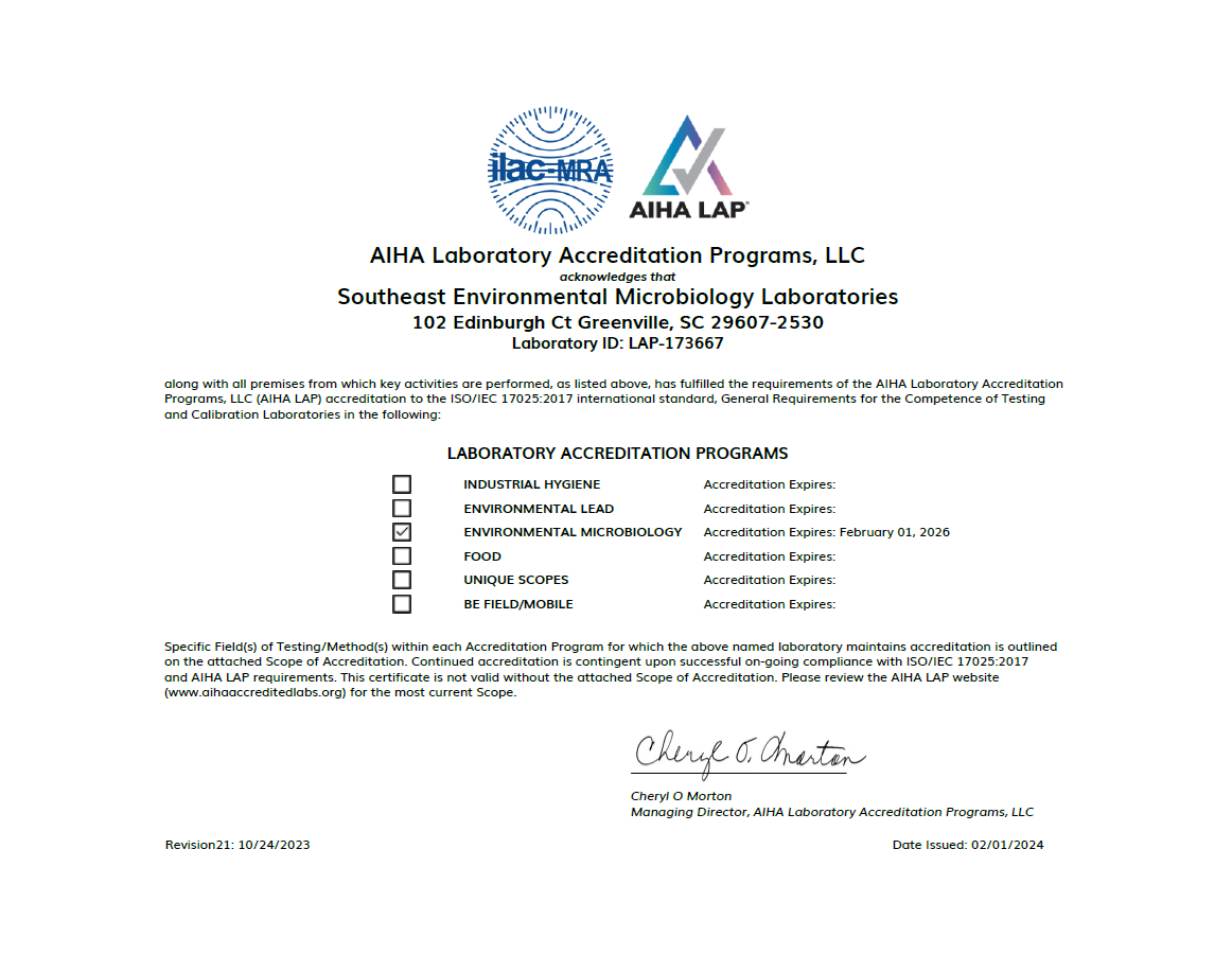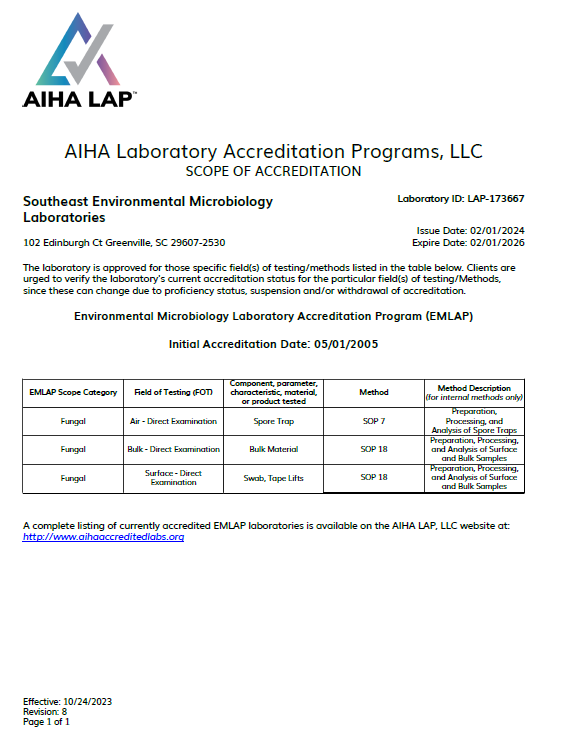 - Accredited by AIHA-LAP, LLC. EMLAP, Lab # 173667.