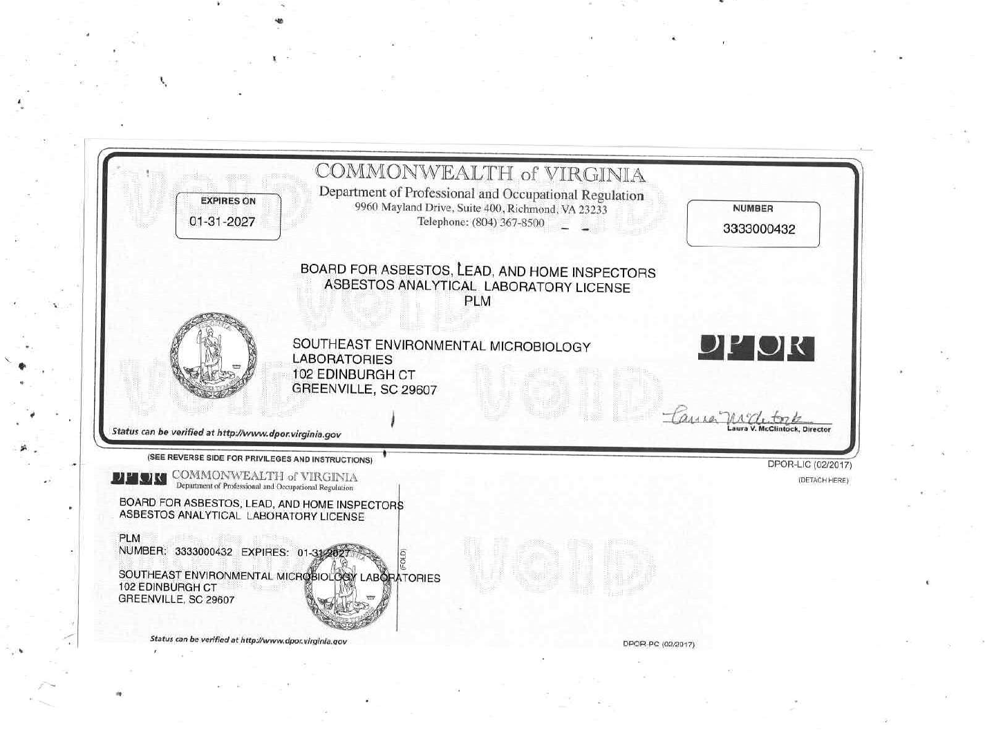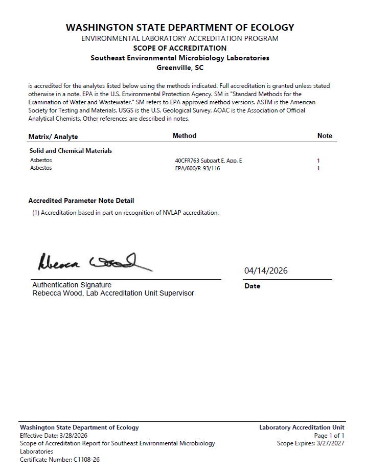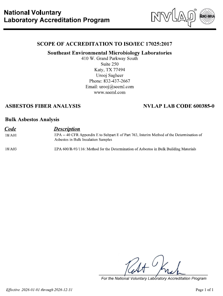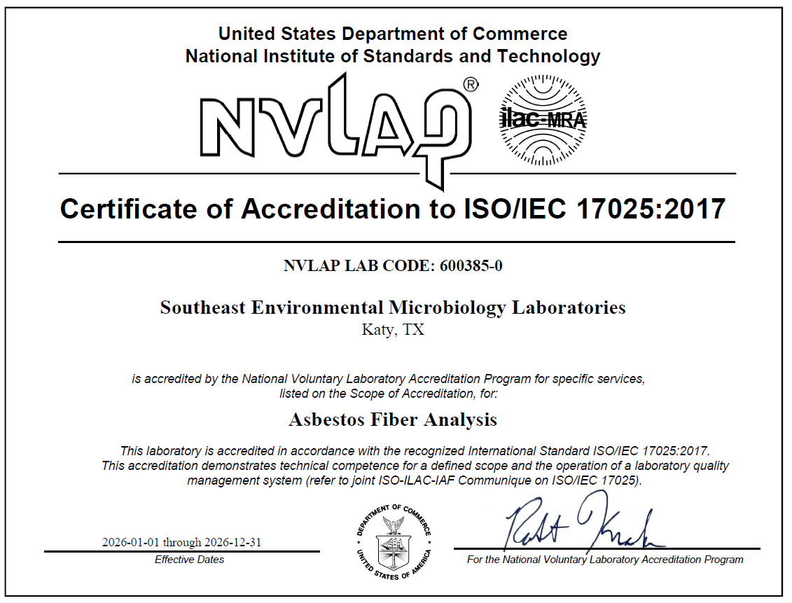 SEEML is accredited by National Voluntary Laboratory Accreditation Program for PLM.(NVLAP Lab Code 201031-0).
