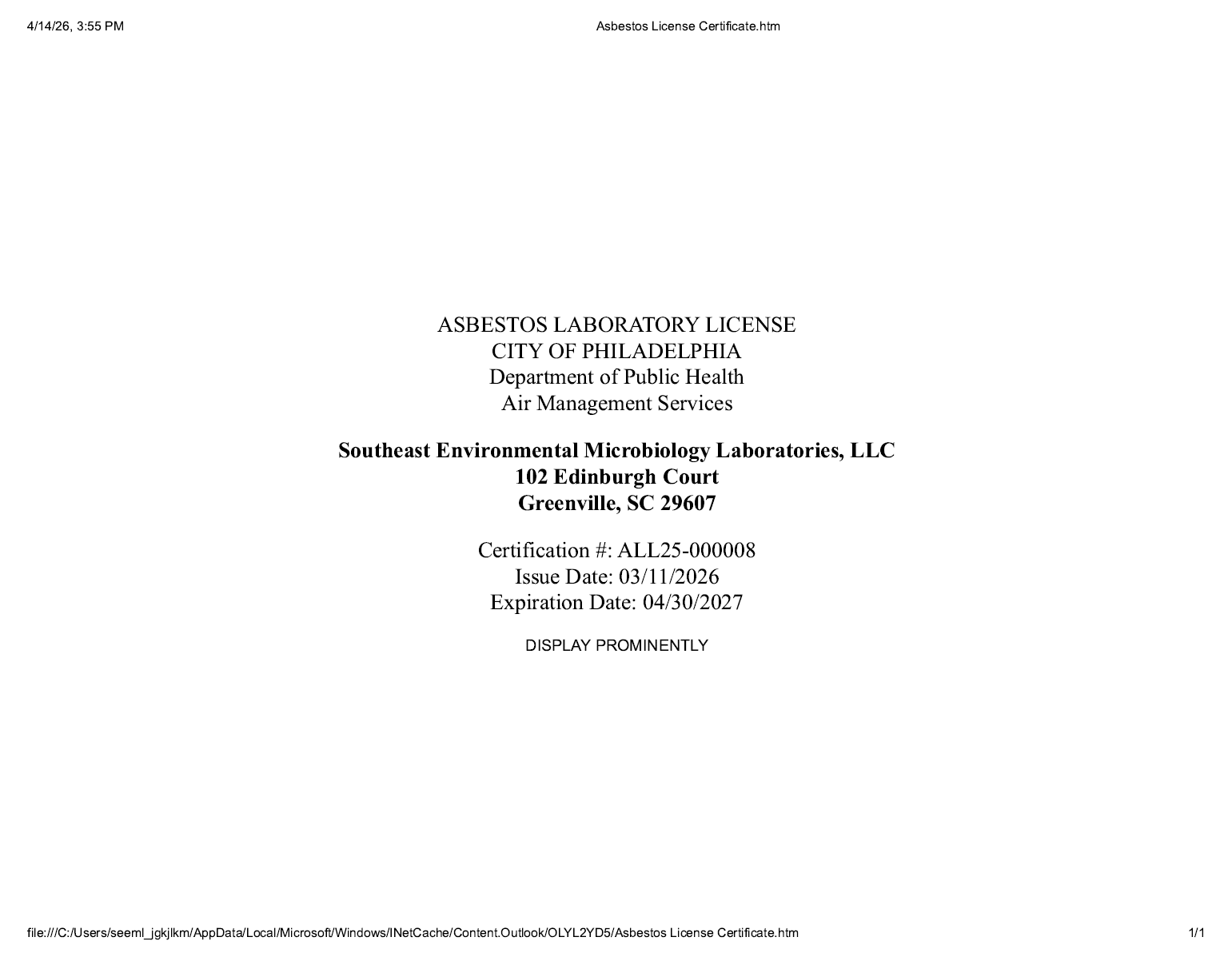 AIHA LABORATORY ACCREDITATION PROGRAM, LLC (EMLAP #173667)